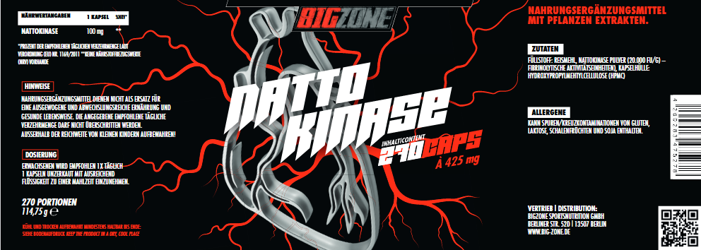 Jede Kapsel BigZone Nattokinase enthält 2000 fibrinolytische Einheiten. Wir empfehlen die Einnahme von einer Kapsel Nattokinase pro Tag. Aufgrund der hemmenden Wirkung auf die Blutgerinnung sollte der Einnahmezeitpunkt möglichst weit vom Krafttraining entfernt liegen.