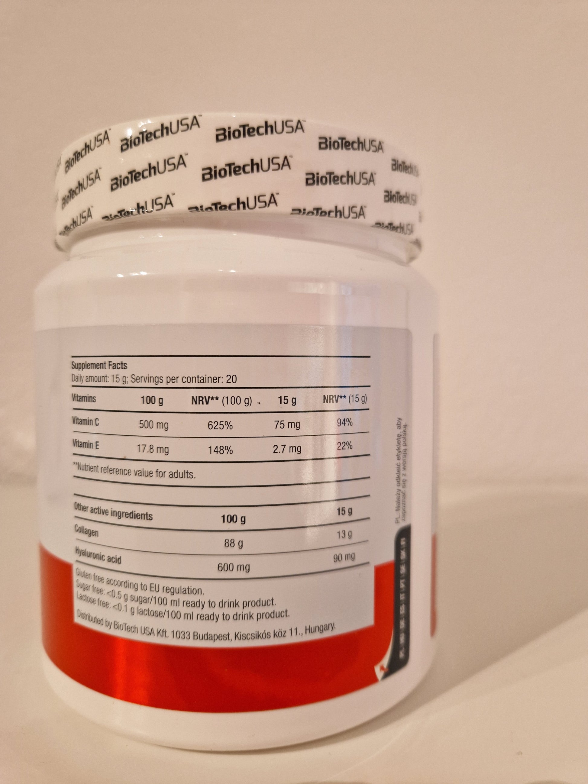 BioTechUSA Collagen liefert praktischerweise zugleich Hyaluronsäure und Collagen. Es enthält weiterhin zusätzliches Vitamin C, das die körpereigene Collagenproduktion unterstützt und letztendlich dazu beiträgt, die Gesundheit deiner Haut, Blutgefäße, Knochen, Knorpel, Zähne und deines Zahnfleischs zu erhalten. Der Vitamin-E-Gehalt des Produkts spielt eine wichtige Rolle beim Schutz der Zellen vor oxidativem Stress.
