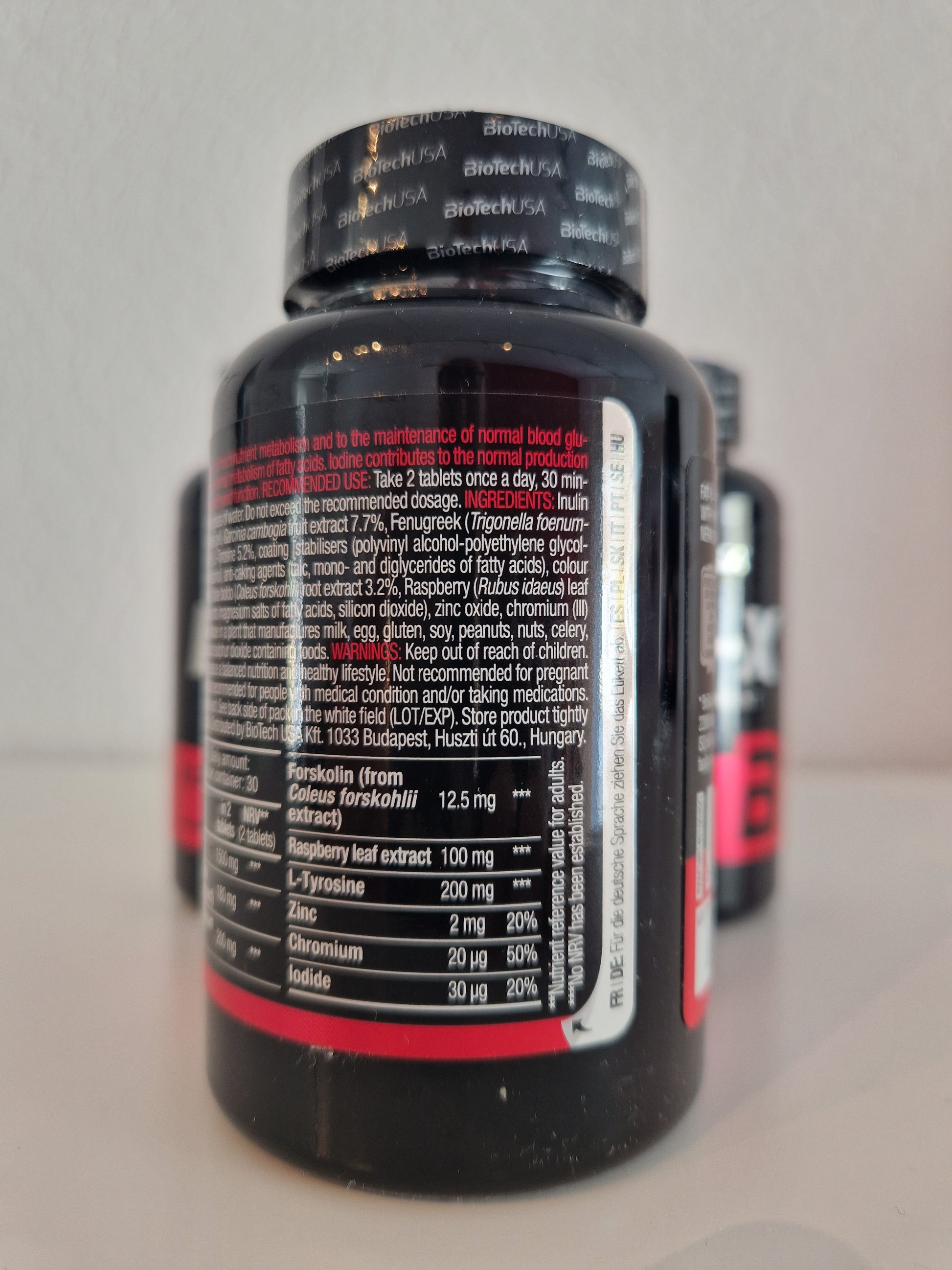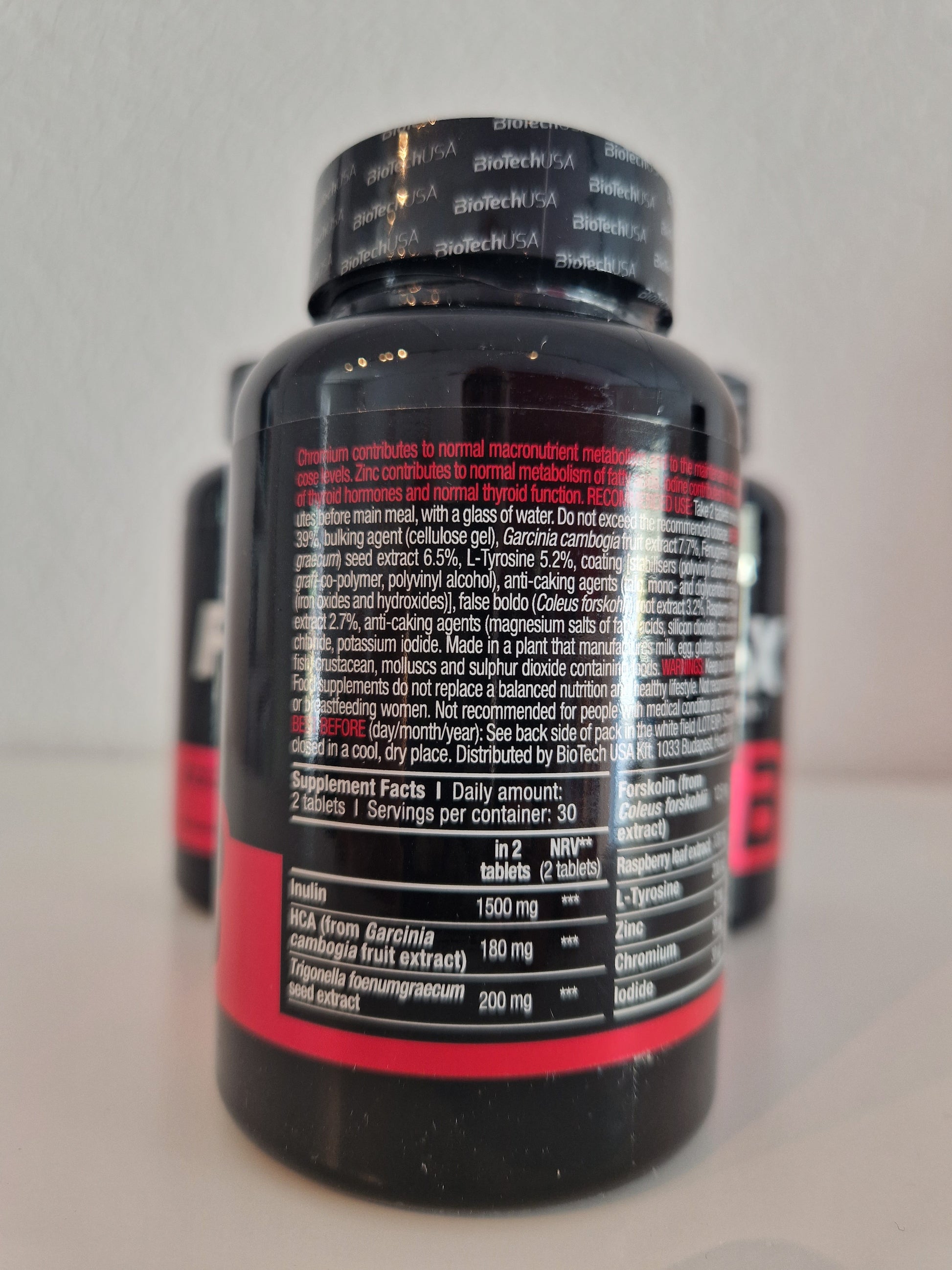 Produkt ohne Stimulanzien mit Pflanzenextrakten, Inulin und HCA, mit L-Tyrosin sowie Zink und anderen Mineralien, die die Verstoffwechselung von Fettsäuren unterstützen.