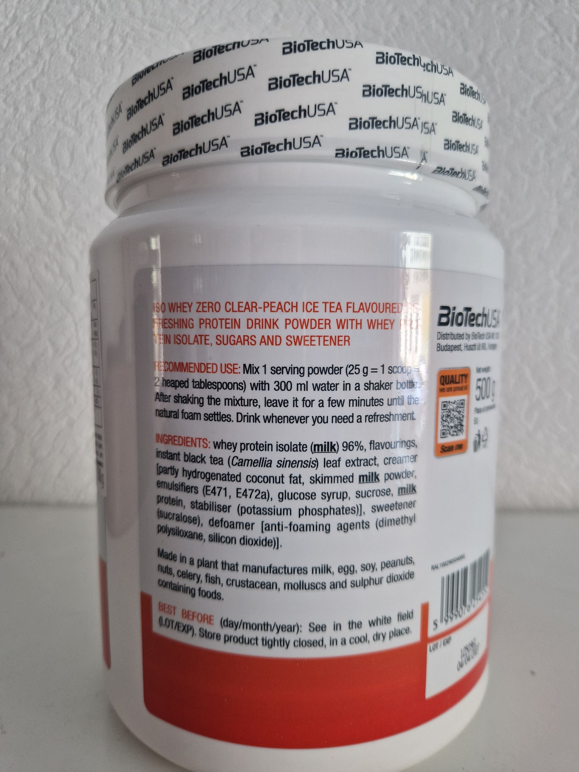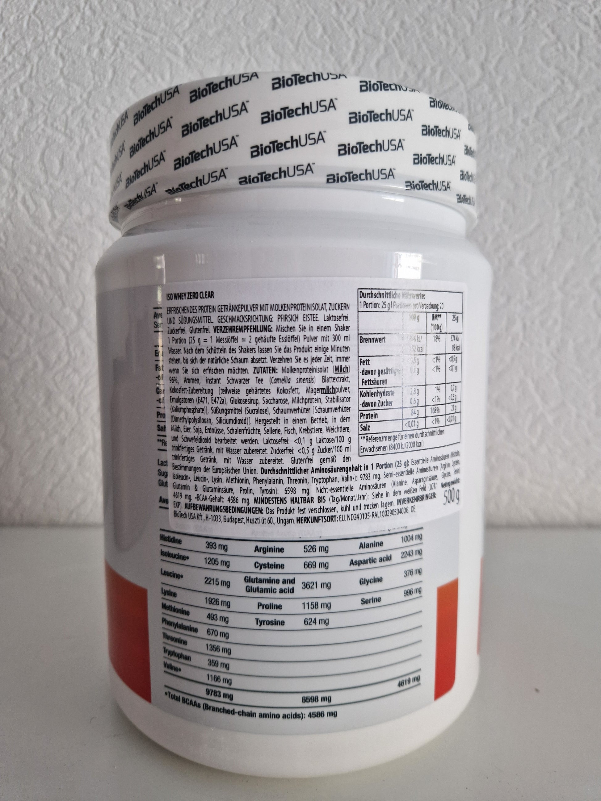 •BCAA-Gehalt: 4586 mg Wie sollte man Iso Whey Zero Clear verwenden?Anwendungsempfehlung: 1 Portion des Produkts (25 g = 1 Messlöffel = 2 gehäufte Esslöffel) in einer Mixflasche mit 300 ml Wasser vermischen. Nach dem Schütteln der Mixflasche das Produkt für zirka eine Minute stehen lassen, bis sich der Schaum gesetzt hat. Gönne es dir, wann immer dir der Sinn nach etwas wirklich Erfrischendem steht! HINWEISE: Der Verzehr dieses Produkts ist kein Ersatz für eine abwechslungsreiche und ausgewogene Ernährung und eine gesunde Lebensweise. InhaltsstoffeMolkenproteinisolat 97%, Aromen, Säuerungsmittel (Citronensäure), Antischaummittel [Schaumverhüter (Dimethylpolysiloxan, Siliciumdioxid), Emulgatoren (E 471, E 435), Konservierungsstoff (Kaliumsorbat), Säuerungsmittel (Citronensäure), Säureregulator (E 507)], Süßungsmittel (Sucralose), Farbstoffe (Tartrazin1, Indigotin). 1Tartrazin: kann die Aktivität und Aufmerksamkeit bei Kindern beeinträchtigen. Hergestellt in einem Betrieb, in dem Milch, Eier, Soja, Krebstiere, Schwefeldioxid und Schalenfrüchte bearbeitet werden. |