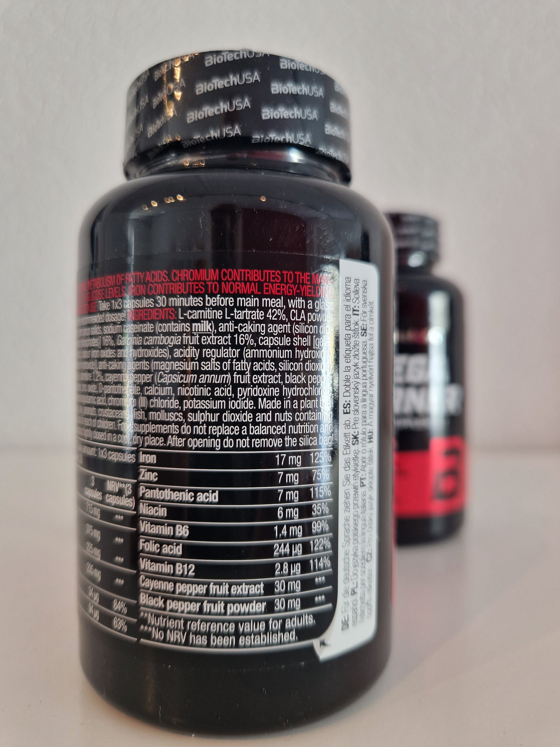 L-Carnitin-L-Tart- rat 42%, CLA Pulver [Glyceride (reich an CLA), getrockneten Maissirup, Natrium-Kaseinat (enthält Milch), Trennmittel (Siliciumdioxid), Stabilisator (Kaliumphosphate)] 16%, Garcinia cambogia Fruchtextrakt 16%, Kapselhülle [Gelatine, Überzugmittel (Schellack), Farbstoff (Eisenoxide und -hy- droxide), Säureregulator (Ammoniumhydroxid), Säureregulator (Kaliumhydroxid)], Trennmittel (Magnesiumsalze der Speisefettsäuren, Siliciumdi- oxid), Eisenfumarat, Acetyl-L-Carnitin 1,2%, Cayennepfeffer (Capsicum annum) Fruchtextrakt, Schwarzer Pfeffer (Piper nigrum) Fruchtpulver, Zinkoxid, Calcium-D-pantothenat, Nicotinsäure, Pyridoxinhydrochlorid, Cyanocobalamin, Pteroylmonoglutaminsäure, Chrom(III)-chlorid, Kalium- iodid.