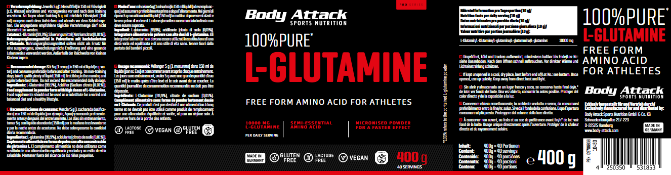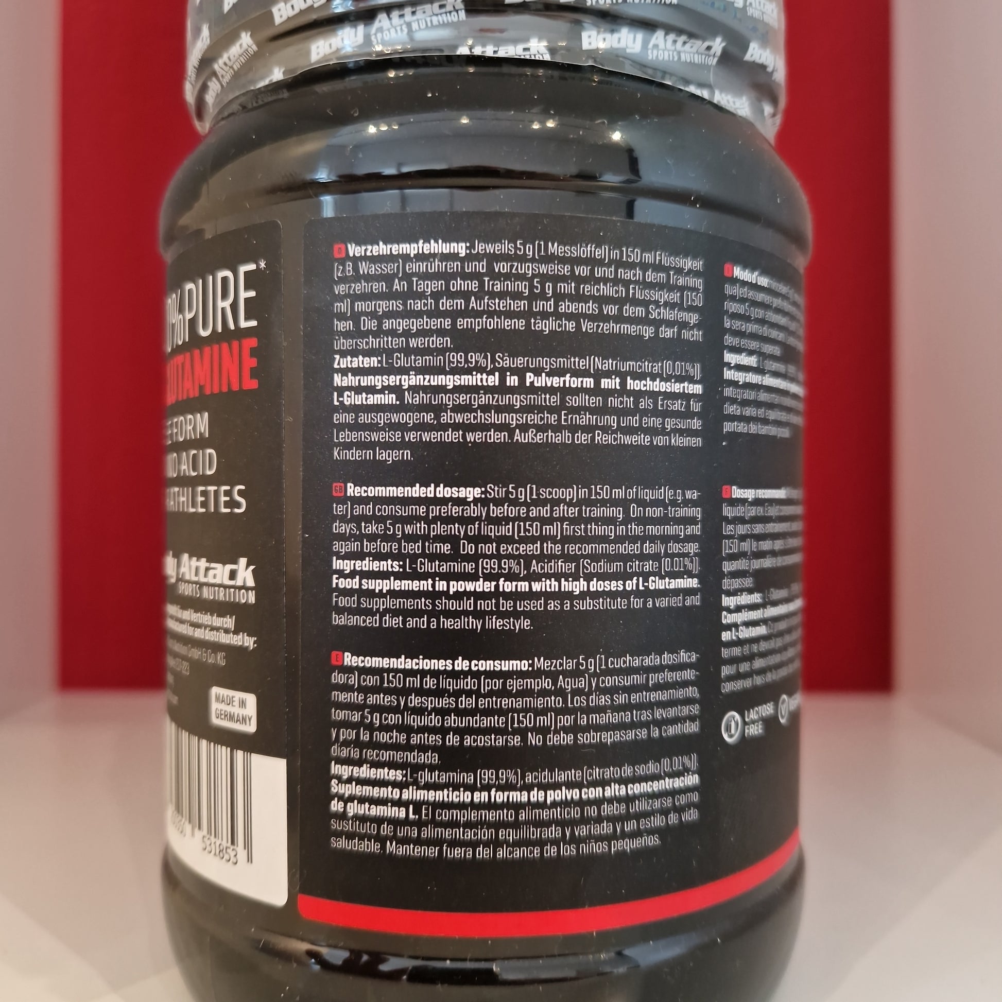 Du bringst deinen Körper mit intensiven Trainingseinheiten immer wieder ans Limit? Gut so! Damit sich deine Muskulatur von diesen Workouts vernünftig erholt, hilft dir unser 100% Pure L-Glutamine. Die Aminosäure ist im Proteinstoffwechsel an wichtigen Um- und Aufbauprozessen beteiligt. Grund genug, deinem Körper ausreichend Glutamin als Baumaterial für deine Muskeln zur Verfügung zu stellen.