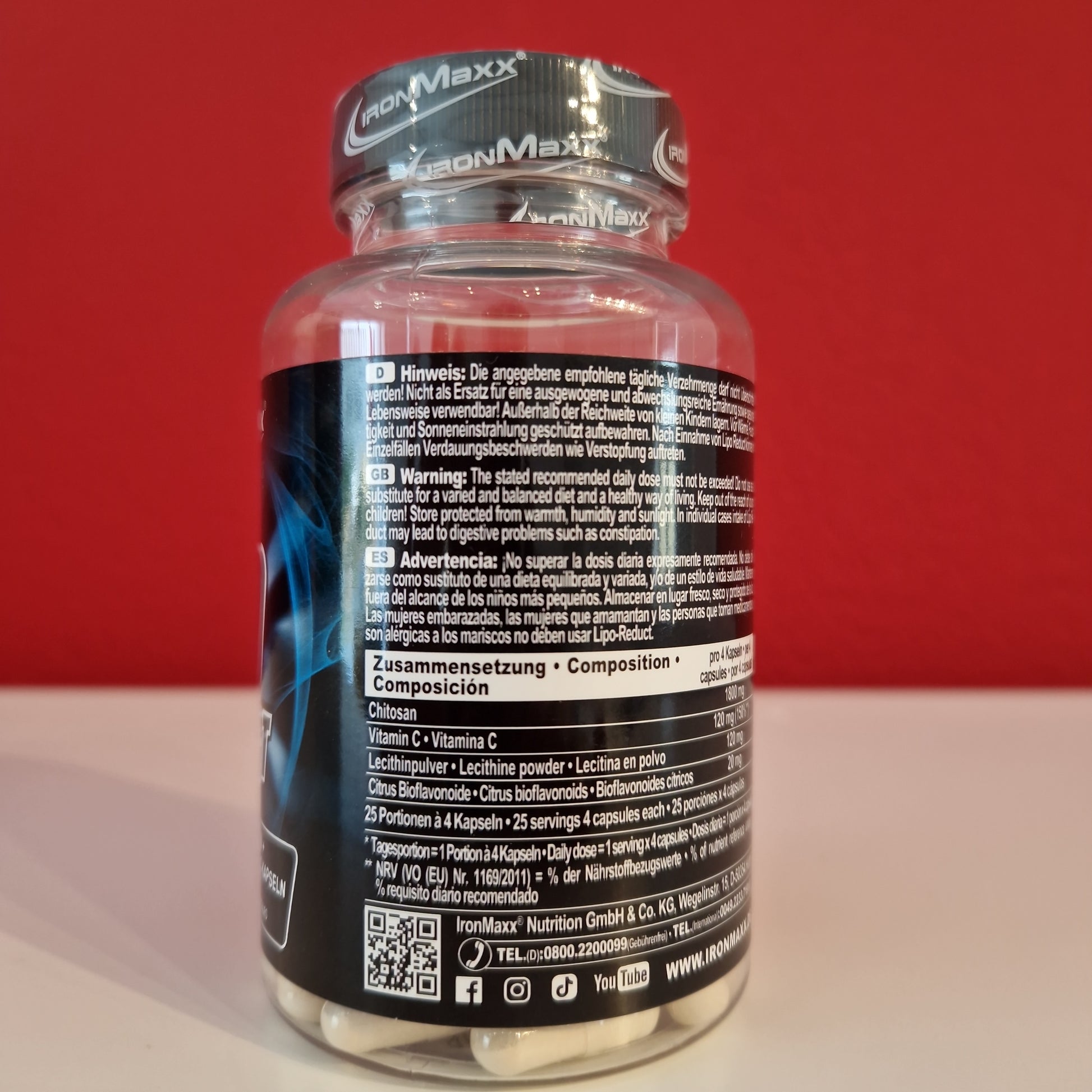 Chitosan (KREBSTIERE), Rindergelatine (Kapsel), Füllstoff (Cellulose), L-Ascorbinsäure, SOJA-Lecithinpulver, Trennmittel (Magnesiumsalze der Speisefettsäuren, Siliciumdioxid), Citrus Bioflavonoide.